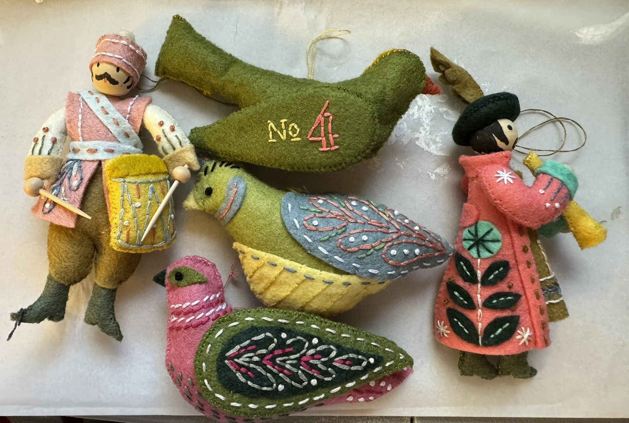 I remembered something: I have a set of 12 Days of Christmas ornaments that my sister made for me a couple years ago. Hand-stitched felt ornaments with embroidery and beadwork. They're gorgeous. They're colorful. And they are absolutely NOT muted vintage.