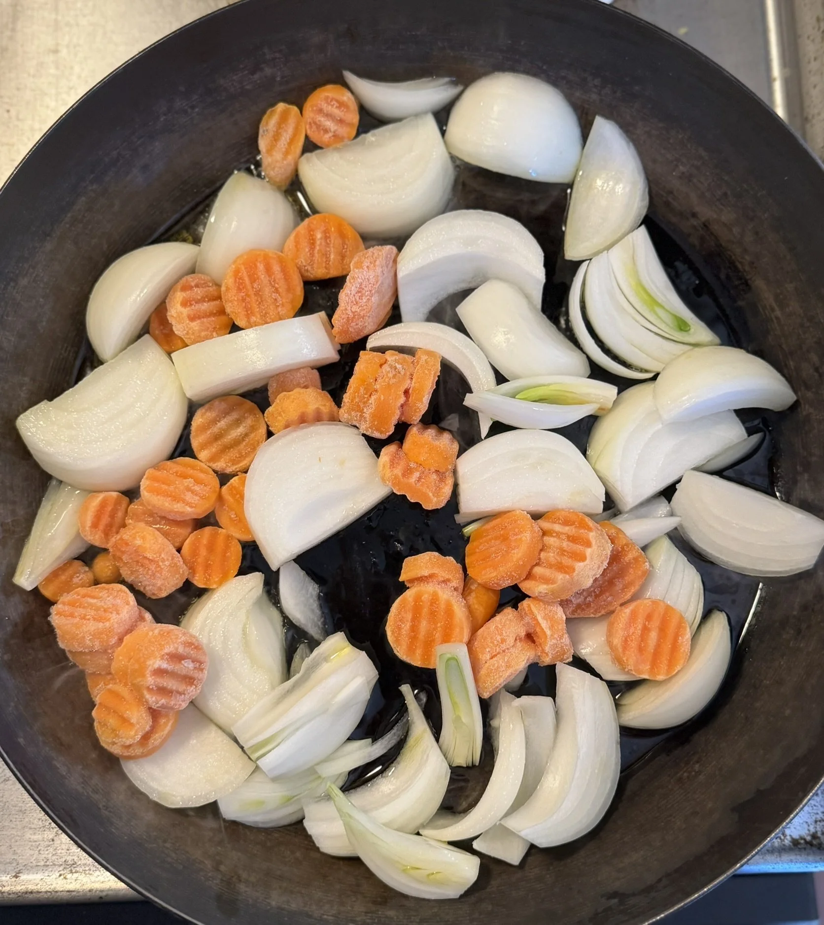 I sauteed two medium sized (sweet) onions along with some frozen carrots in about 3 TBSP of olive oil until they were tender and had a bit of a crust on the edges.