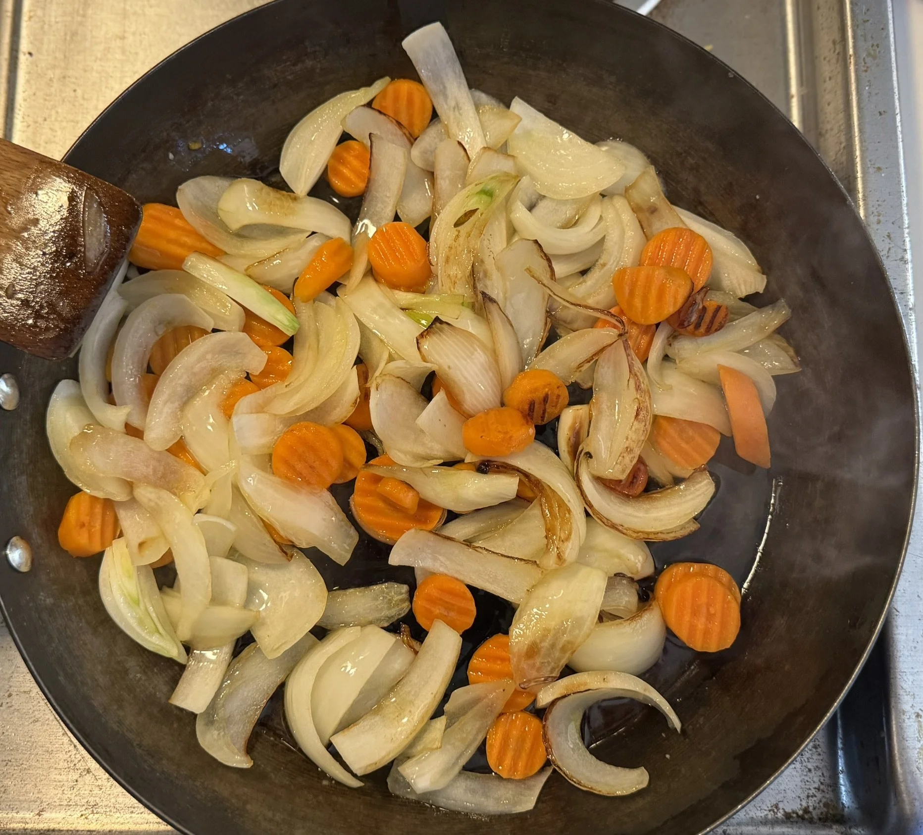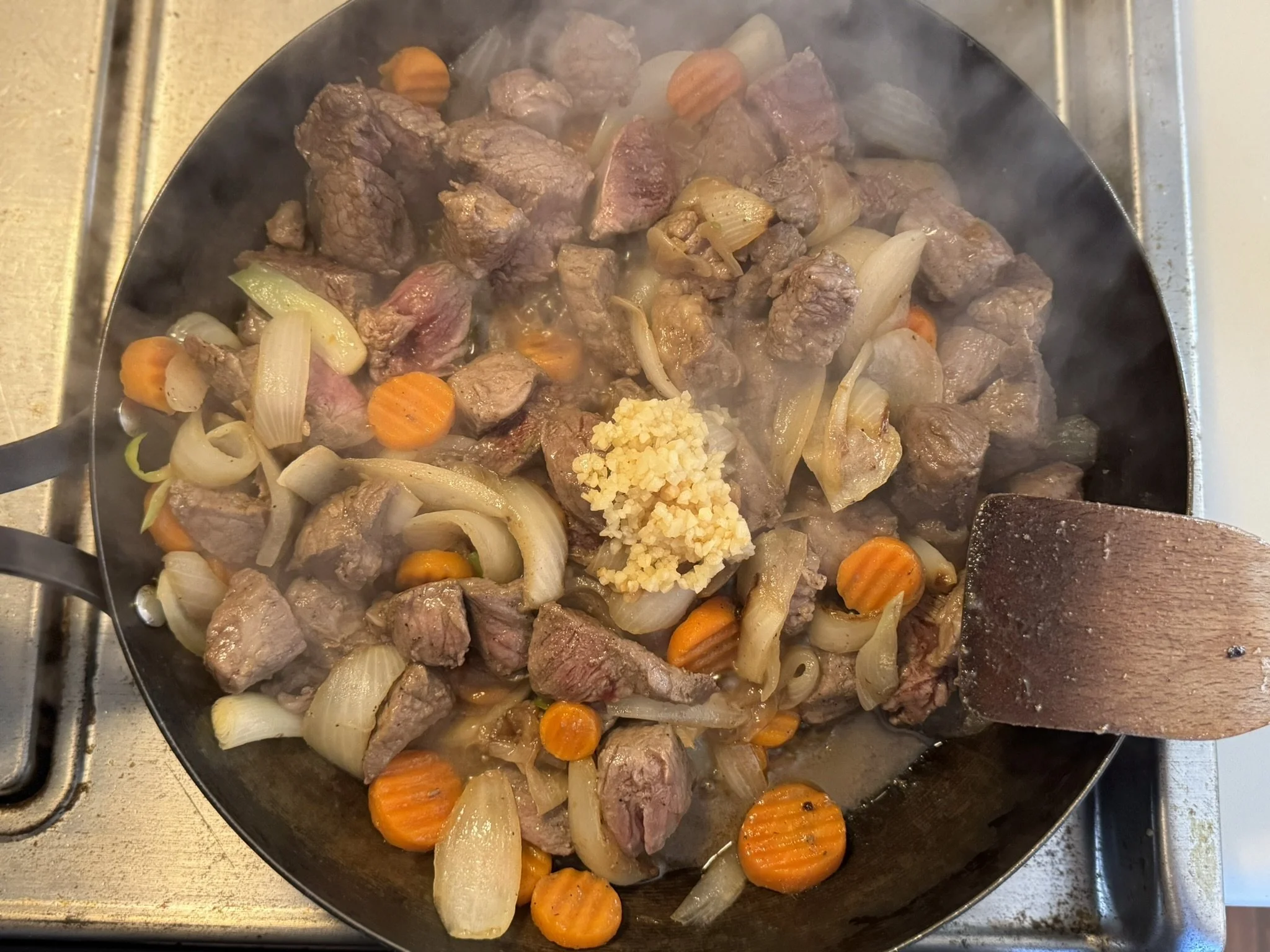 The meat seared quickly on high (along with the onions and carrots) to give it a nice crust - about 3-4 minutes. Then lower the temp to medium heat and cooked for another 4-5 minutes. Add garlic and cook for another minute or so until fragrant.