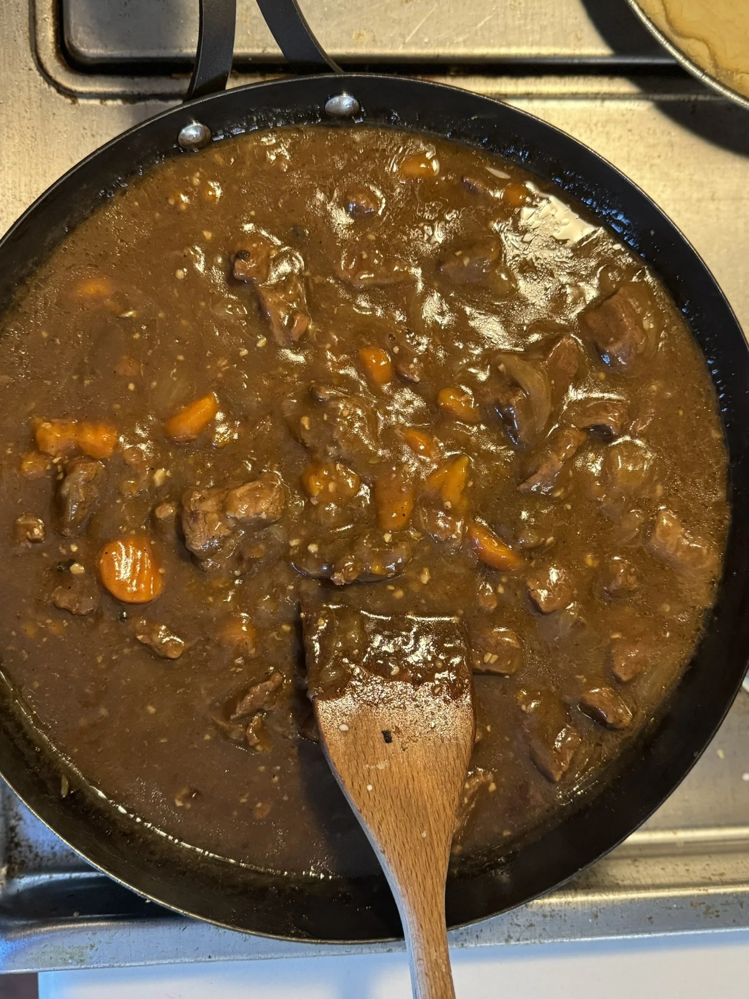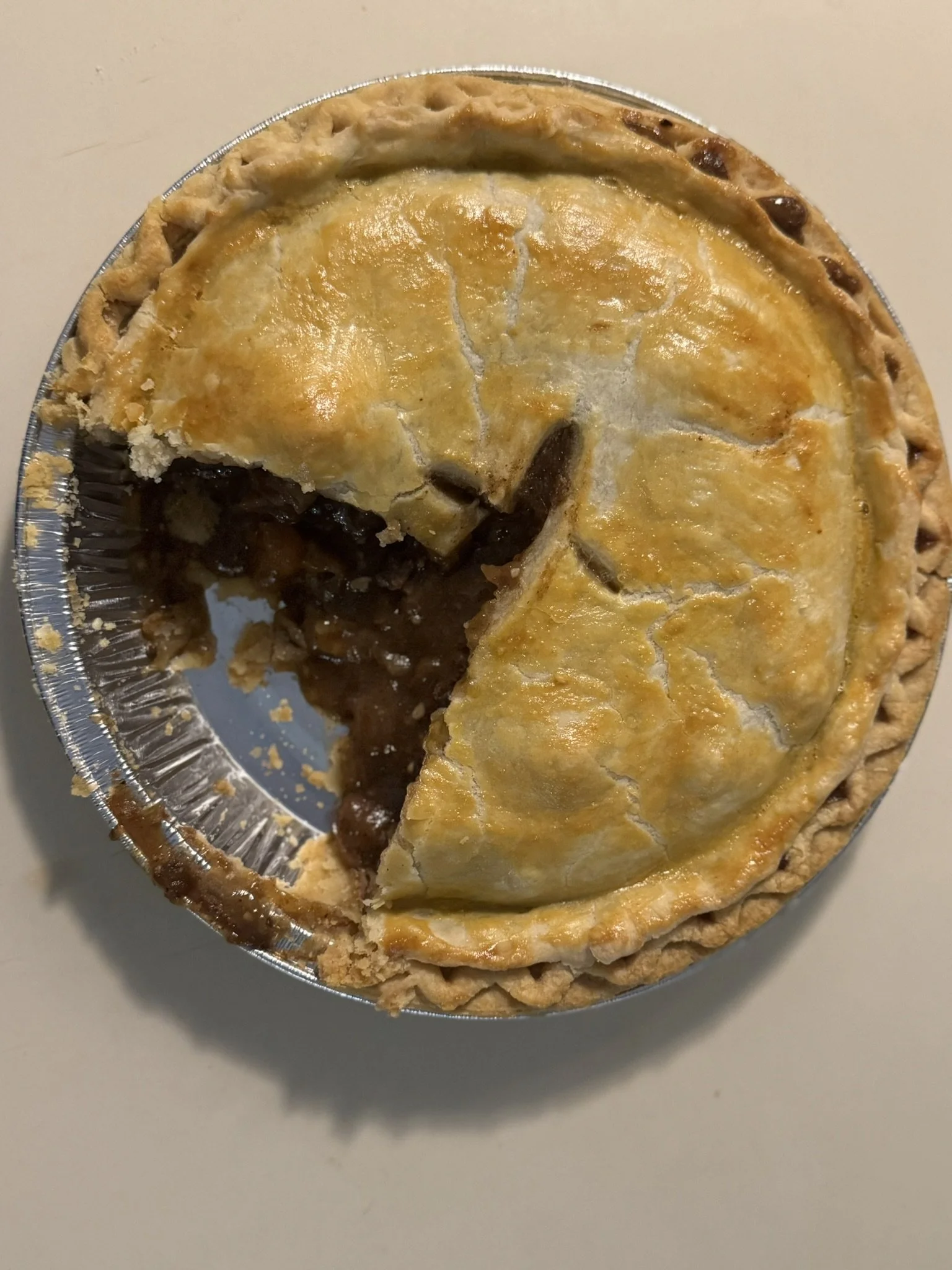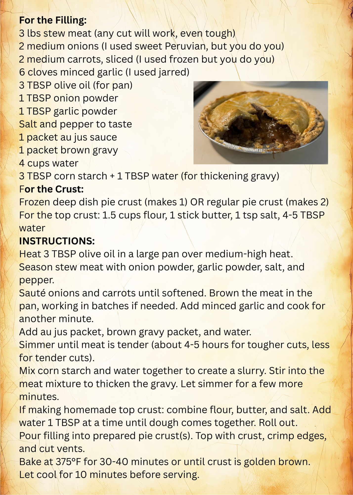 One of our favorite dinners is beef tips and rice. Two small tweaks (subtracting rice/adding pie crust) and thickening the sauce, and poof, we have steak pie.