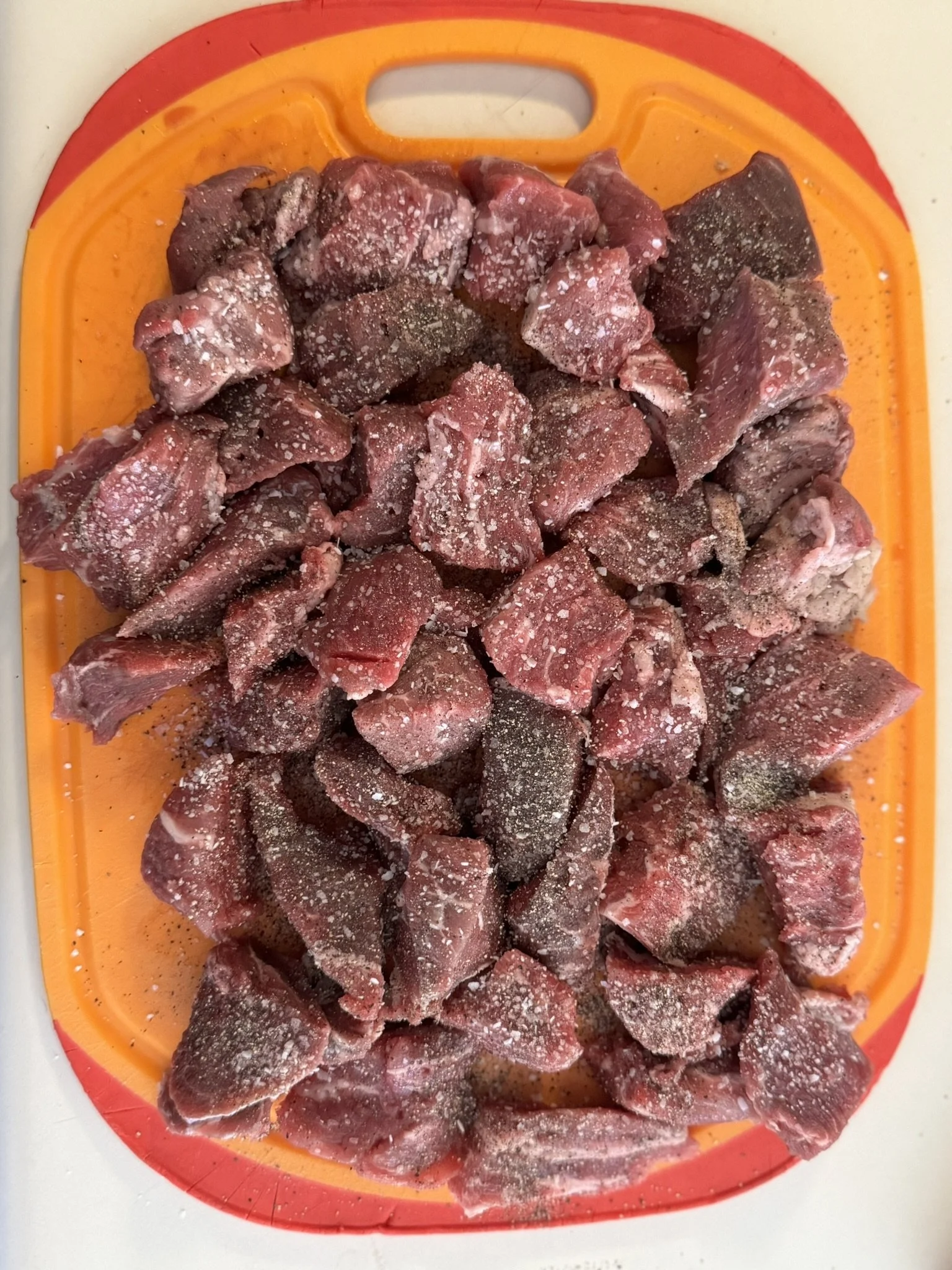 I used stew meat, purchased in bulk from Sam’s, but pot roast, ribeye, flank steak, or any other cut would work. It doesn’t matter if it’s a tough cut (like this stew meat) because this is going to cook for several hours and will be melt in your mouth tender by the time we’re done. The meat is seasoned well with salt, pepper, onion powder, and garlic powder.