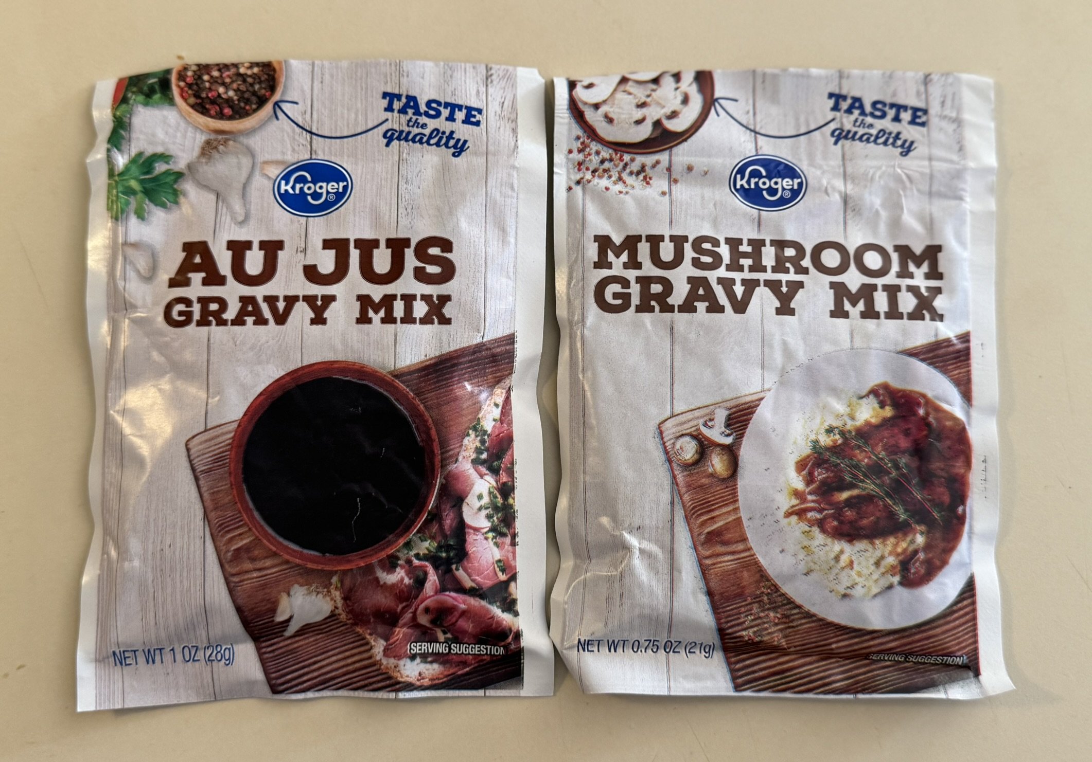 1 packet each of Au Jus gravy mix and Mushroom (or Brown) gravy mix and 4 cups of water.
